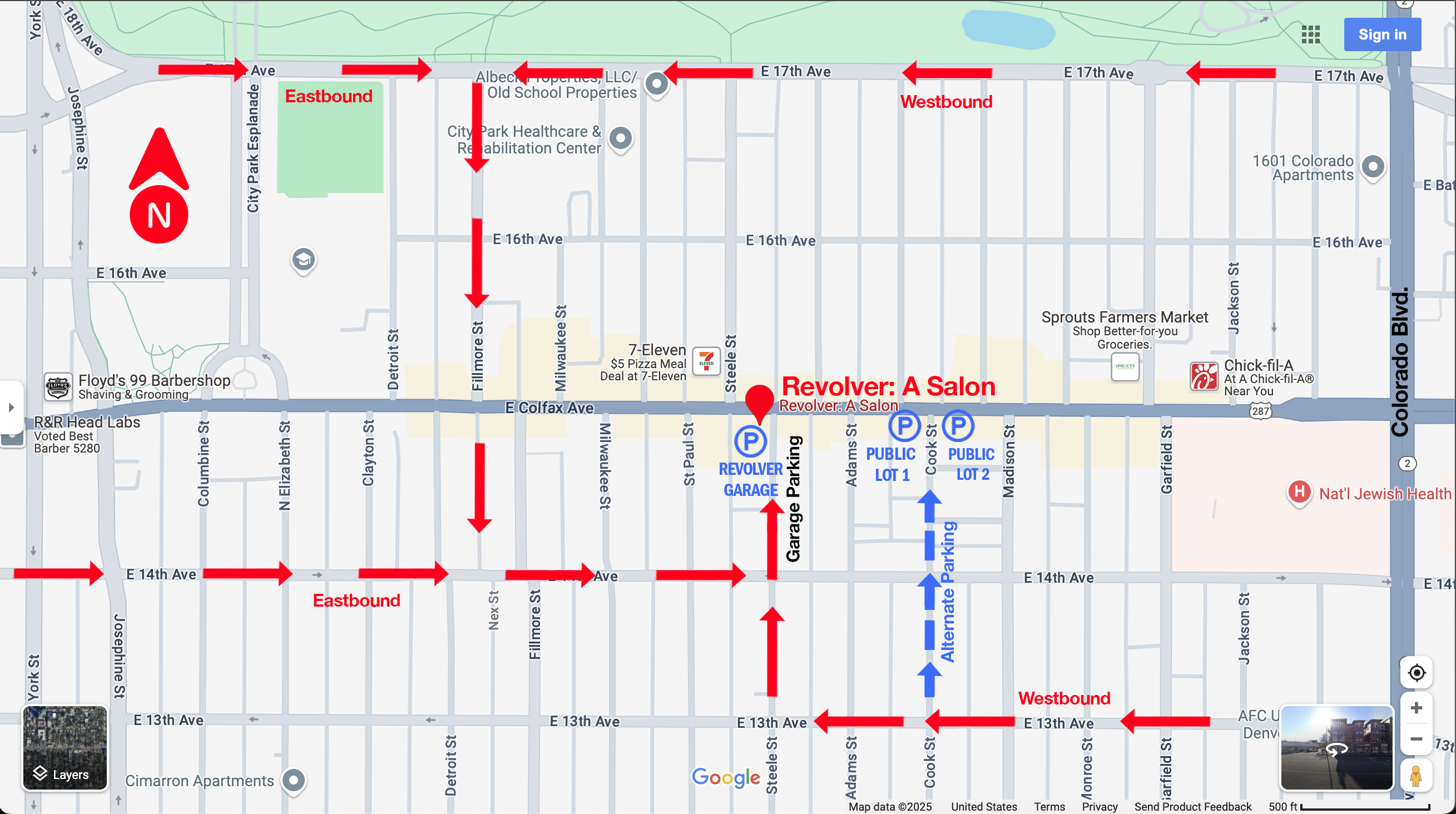 The RTD Bus Rapid Transit construction project has officially begun on our section of Colfax: Williams St to Cherry St. Revolver Salon will remain open and maintain normal hours for the duration of this project. We expect minimal business disruption during construction, however, travel and parking may be affected in the upcoming months. To help make this season as painless as possible, we’ve created the following driving and parking directions to help you avoid Colfax. We also suggest leaving extra drive time.